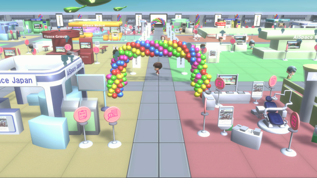 AiSpaceはインターネット上のバーチャル空間に⾃分の分⾝(アバター)を作り、現実世界のように、見たり聞いたりできるほか、チャットやビデオ通話を使い、リアルタイムで出展社と参加者が交流できるサービスです。また、親しみやすい空間やユーザーインターフェースを取り入れ、ご利用になる全ての方に楽しんでいただけるように設計しました。